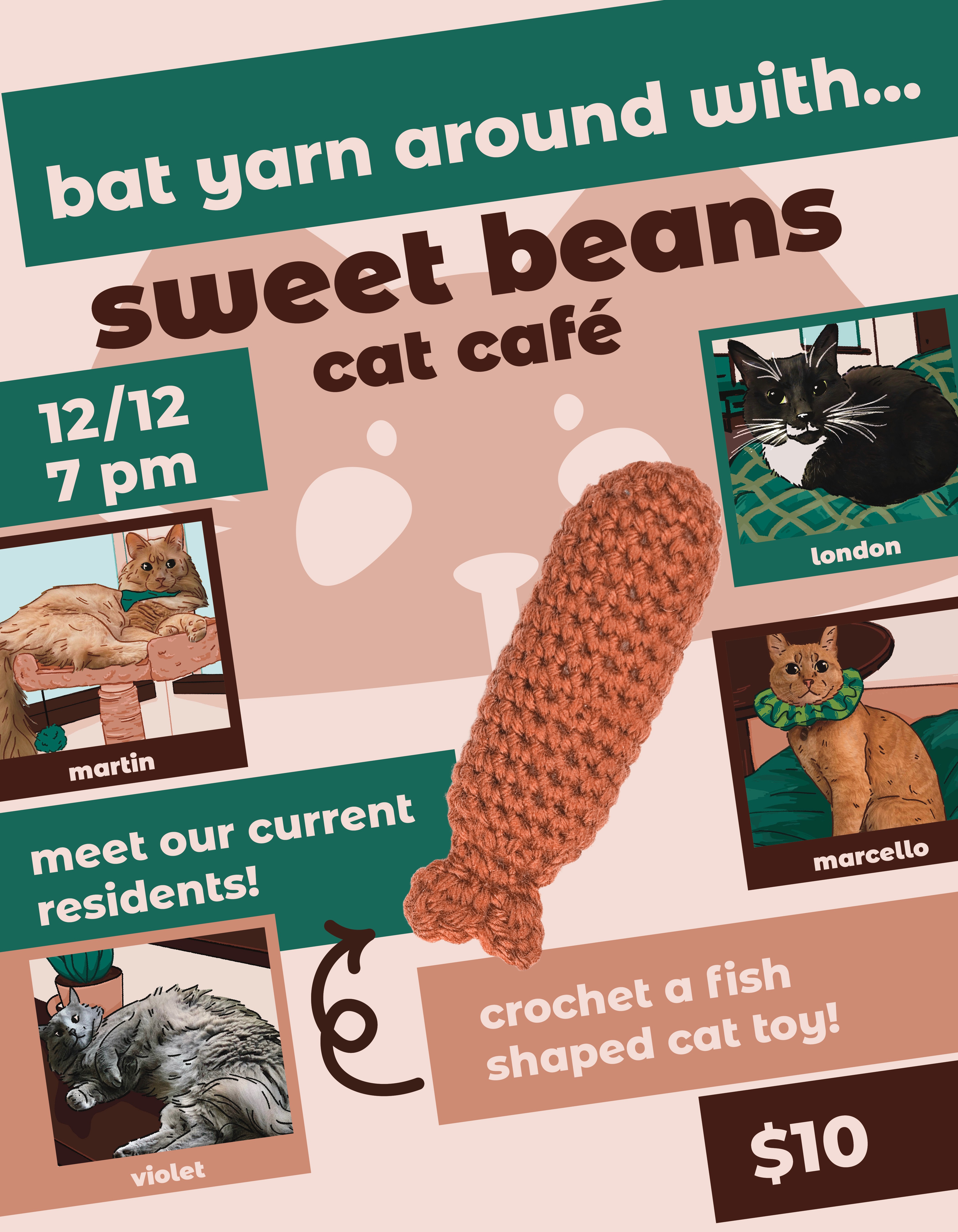 Every second Friday of the month, Sweet Beans Cat Café hosts a craft night. For only $10, participants receive all the supplies needed to create the month's craft, as well as the ability to spend time with some of the cafe's current kitty residents, who are also available for adoption! Although each craft night has a featured craft with instruction, participants are welcome to bring their own craft to work on during the event.